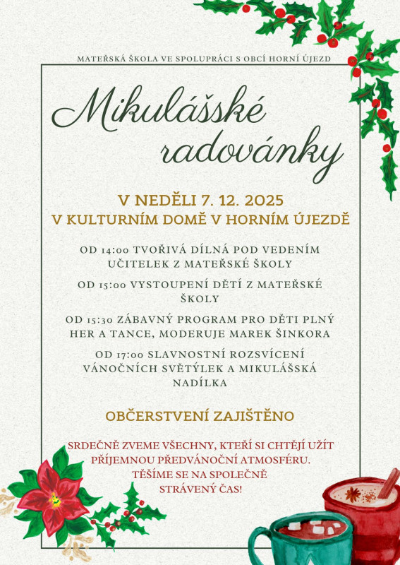 PO 22. 12. 2025 – PÁ 2. 1. 2026 Provoz mateřské školy do 23. 12. 2025. Provoz od pondělí 5. ledna 2025. Prosíme rodiče, aby docházku potvrdili nejméně 2 pracovní dny předem. |