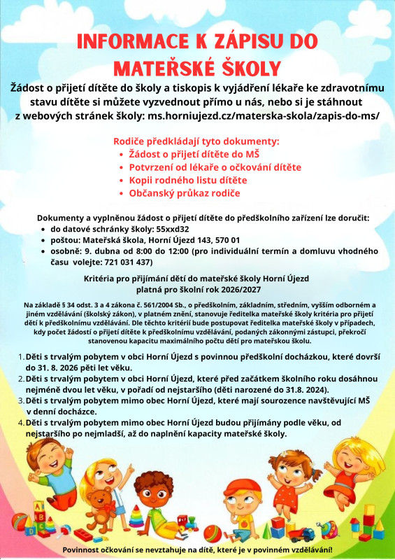 9. 4. 2026 - ZÁPIS DO MŠ NA ŠKOLNÍ ROK 2026/2027